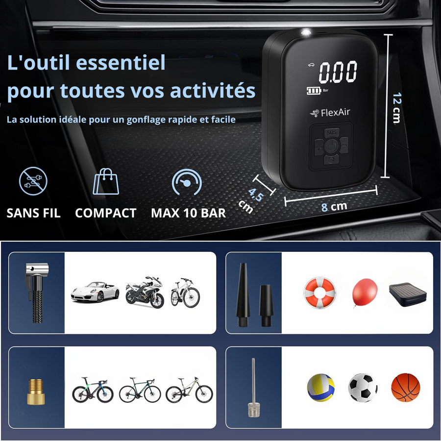 Our FlexAir electric pump has a long battery life. With a single battery charge, it can inflate between 5 and 6 fully deflated mid-size car tyres from 0 to 2.5 bar. This gives you great flexibility, whether on or off the road.